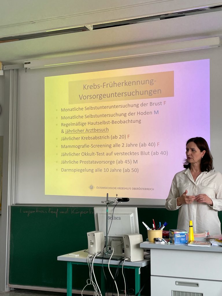 Am 20.04.23 kam Frau Maria Sauer, Geschäftsführerin der Krebshilfe Oberösterreich, zu den Schüler*innen der 8ABP und 8BBP, um einem Vortrag über Krebsvorsorge zu halten.